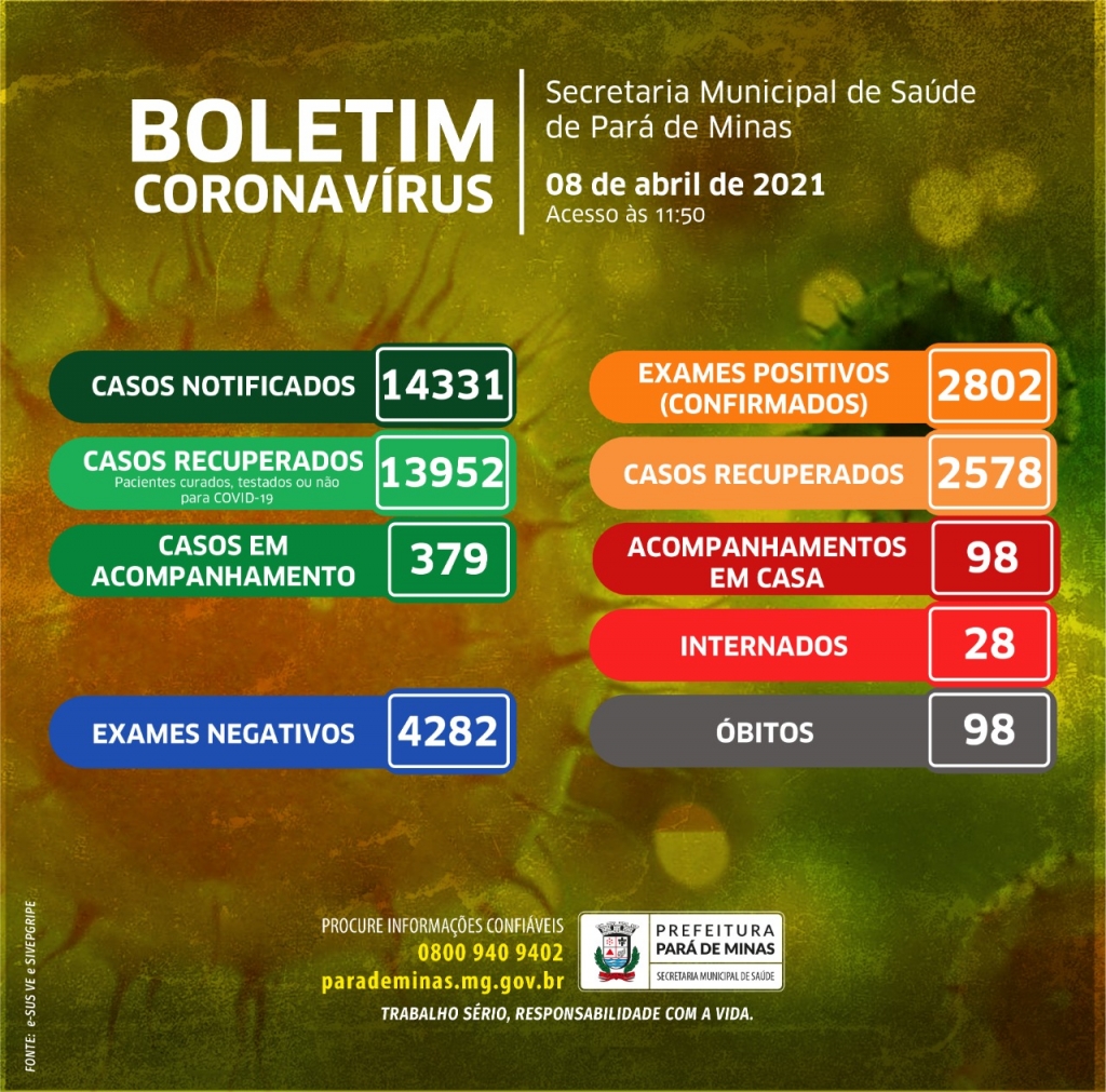 A atualização do boletim do coronavírus em Pará de Minas confirma mais duas mortes no município, sendo um paciente de 50 anos e o outro de 61 anos. Já os novos diagnósticos da doença foram assustadores. Em apenas 24 horas, 52 casos foram confirmados. É o maior número desde o início da pandemia.