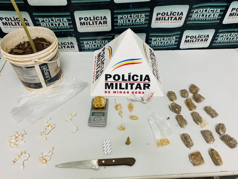Na casa do jovem foram localizadas  89 pedras crack prontas para serem vendidas, cinco pedras da mesma droga  de tamanho médio, uma pedra de crack grande, um pé de maconha, um  pino de cocaína, uma  balança de precisão, uma  faca com restos de entorpecentes e saquinhos normalmente usados para embalar drogas. O jovem foi preso em flagrante.