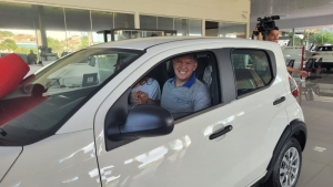 O veículo foi entregue na Pavepe – um Fiat Mobi, avaliado em R$70 mil. Acompanhado da esposa, ele ajudou a descobrir o carro que estava envolto em um uma capa vermelha com um grande laço: