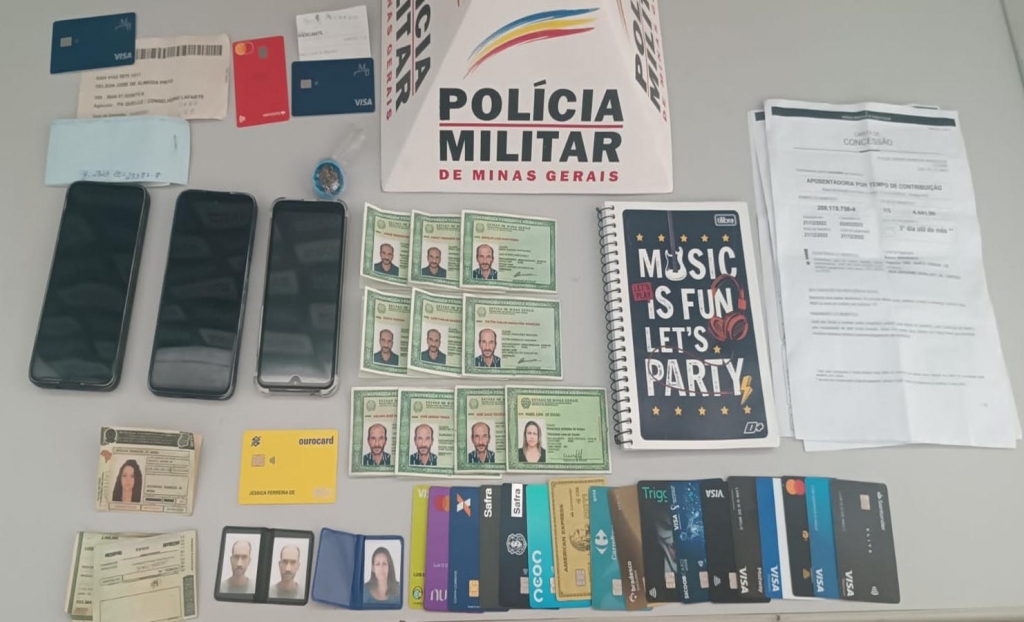 Os dois ocupantes do carro foram abordados na Praça  Padre José Pereira Coelho. No veículo foram encontrados diversos documentos de identidade falsificados, vários cartões de bancos e uma bucha de maconha.