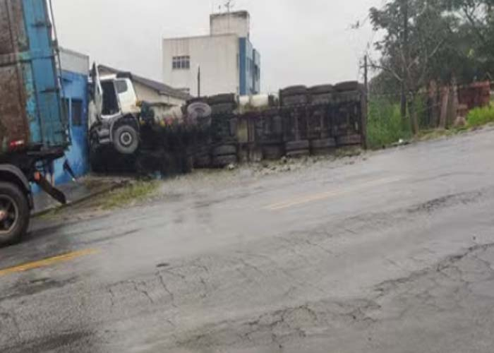 As imagens mostram o veículo descendo pela Rua Antônio Neto, no Bairro Manoel Valinhas. Em segundos, a carreta sai da pista e destrói o muro. Na sequência, o veículo tomba e só para ao atingir a parede da empresa.