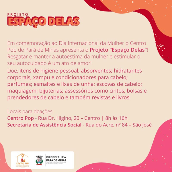 No mês em que se comemora o Dia Internacional da Mulher, o Centro Pop de Pará de Minas lançou o projeto Espaço Delas.