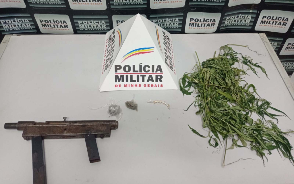 Durante patrulhamento de rotina, a equipe Tático Móvel, juntamente com outras viaturas do turno, se deslocou até o local indicado. Ao abordar o suspeito, os policiais encontraram 05 pedras de crack e 02 buchas de maconha com o indivíduo. Além disso, em sua residência, os militares localizaram um pé de maconha e, no quintal da casa, uma arma de fogo artesanal, tipo submetralhadora.