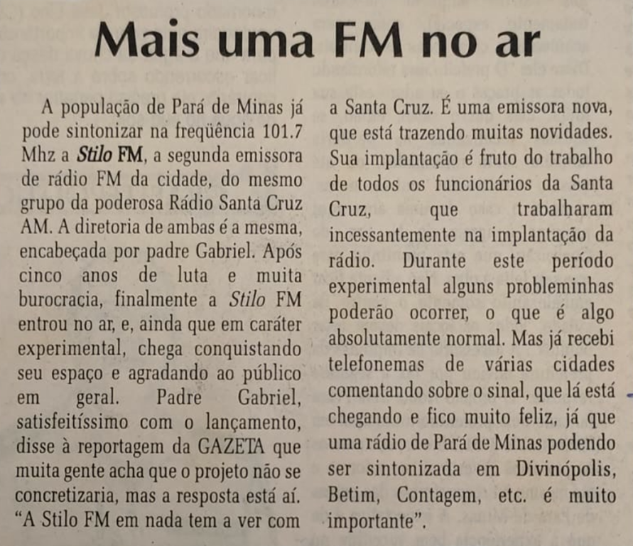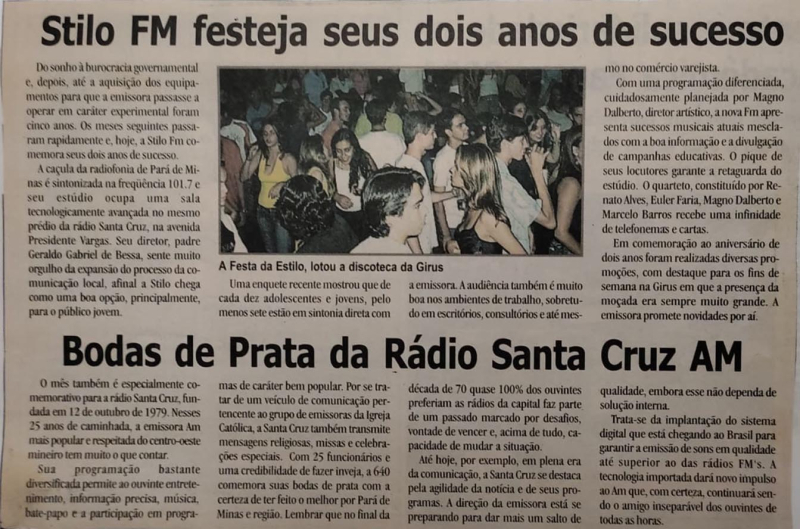 Pará de Minas completou, no último dia 20, 165 anos de emancipação política e administrativa. Devemos admitir, que boa parte dessa história passou pela Rádio Santa Cruz e pela Stilo FM. Afinal, são 46 anos levando ao ar as notícias de nossa cidade e região! A Santa Cruz, celebra no dia 12, dia de Nossa Senhora Aparecida, 46 anos. Hoje, ela faz parte da vida de nosso povo e tem a cara de Pará de Minas. A Stilo FM ainda é jovem e conta com, apenas, 23 aninhos.