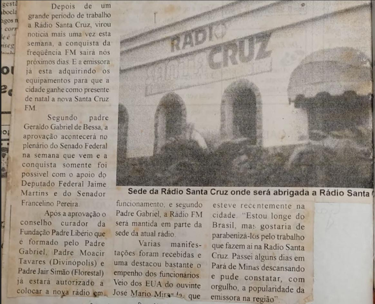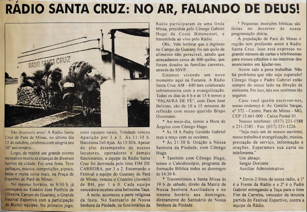 A primeira transmissão da Rádio Santa Cruz se deu no dia 12 de outubro de 1979 quando ela levou ao ar a “Hora do Ângelus”. Foi uma grande alegria em Pará de Minas. A nova emissora mudou muita coisa na Cidade. Seu compromisso com a informação e com os valores religiosos sempre marcaram sua trajetória mesmo antes de ser adquirida pela Diocese de Divinópolis em 1995. Ela sempre manteve no ar uma programação religiosa.