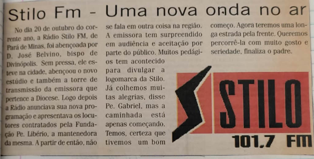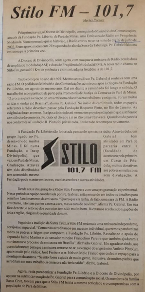 A Stilo FM nasceu sob a proteção do Venerável Servo de Deus Pe. Libério, que nomeia sua Fundação mantenedora. A primeira transmissão da Stilo FM ocorreu no dia 09 de julho de 2002, às 21h. A partir daquela data Pará de Minas e região passou a contar com mais uma boa emissora de rádio. Aquela noite estava escura, porém estrelada. Eu estava, juntamente, com o engenheiro Antônio Pinto e José Freire no alto da Serra das Antenas quando ouvimos, pela primeira vez, o som da nova rádio, como quem ouve o riso de uma criança recém nascida.