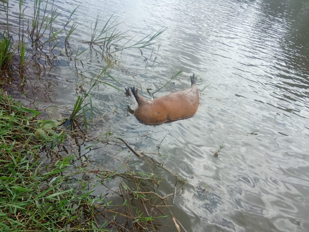As imagens mostram o animal com a cabeça debaixo d’água e as patas para cima. A principal suspeita é que a capivara tenha sido atacada por cães de grande porte, uma vez que ela apresentava vários ferimentos no corpo.
