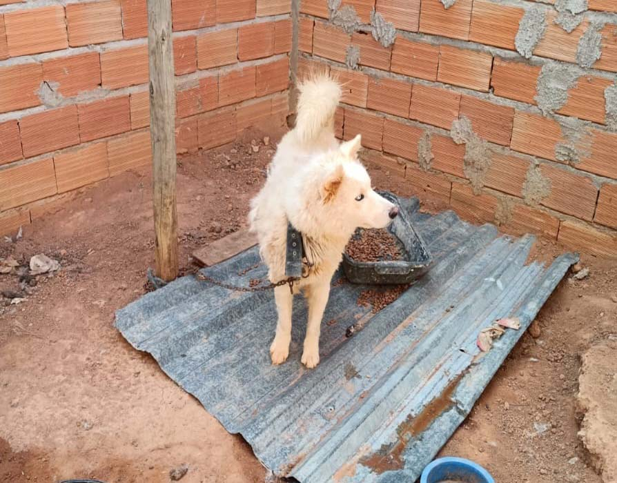 Em outro ponto do mesmo imóvel, os militares encontraram um segundo cachorro, de grande porte e aparentando ser da raça Akita, também acorrentado e exposto ao sol e à chuva, sem qualquer tipo de abrigo.