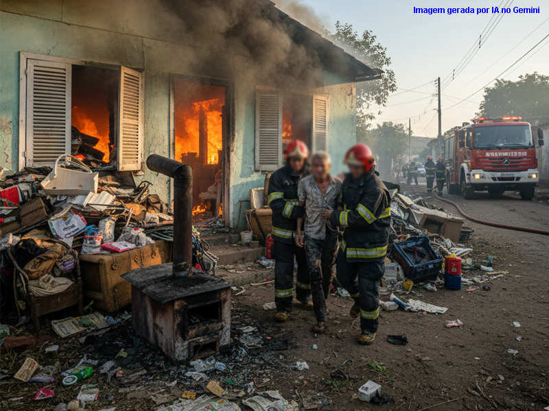 Um idoso de 67 anos foi resgatado pelo Corpo de Bombeiros após um incêndio que destruiu parte de sua residência, em Itaúna. A vítima foi socorrida com sinais de desidratação e irritação ocular, após inalar grandes quantidades de fumaça. O incêndio teria se iniciado enquanto o morador preparava alimentos em um fogão a lenha. No momento do resgate, os militares encontraram o homem no interior da casa, que estava repleta de materiais recicláveis, lixo e entulho acumulado.