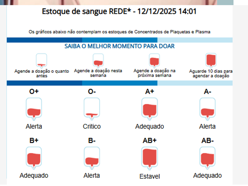 Os estoques de sangue da rede Hemominas estão abaixo do nível considerado ideal. Segundo a instituição, há uma queda entre todos os tipos sanguinesos, mas a situação mais preocupante está nos tipos negativos, que estão em estado de alerta ou até mesmo em nível crítico.