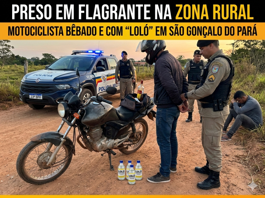 Um homem foi preso pela Polícia Militar após ser flagrado dirigindo embriagado e ainda transportando frascos de “loló” na zona rural de São Gonçalo do Pará. A ocorrência foi registrada no domingo, dia 8, durante patrulhamento dos militares do 23º Batalhão da Polícia Militar no povoado de Prata de Cima.