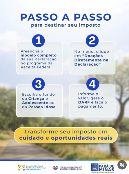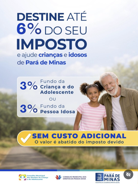 A iniciativa incentiva os contribuintes a destinarem parte do Imposto de Renda devido para o Fundo Municipal da Criança e do Adolescente ou para o Fundo Municipal da Pessoa Idosa em Pará de Minas.