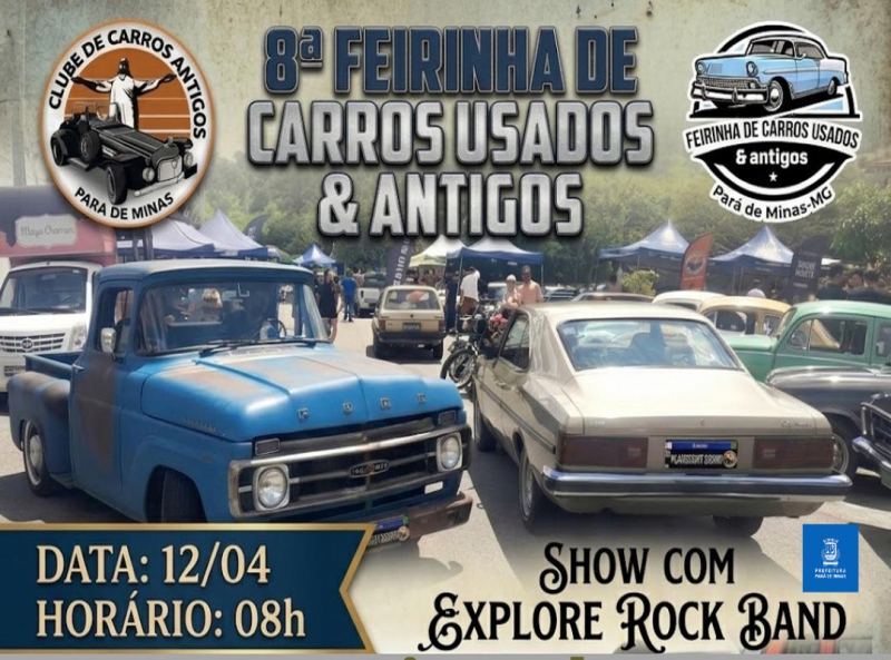 A Feirinha de Carros Usados & Antigos de Pará de Minas está de volta. Ela vai acontecer amanhã, a partir das 8 horas, ao lado do Campo do Paraense. O evento chega à oitava edição e será aberto com um show musical da dupla Camila e Otávio.
