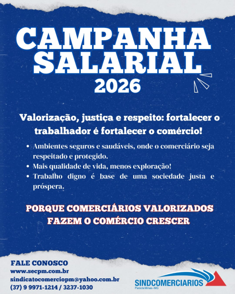 Hoje o salário base do comércio em Pará de Minas é de R$1.628,00. Para 2026 a expectativa é de um reajuste equivalente ao índice da Inflação, mais o PIB e o ganho real.
