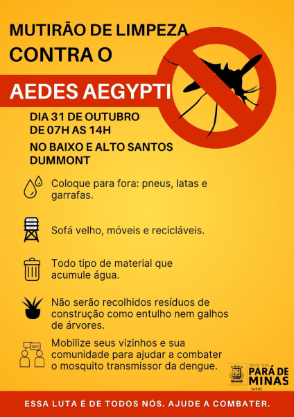 O bairro Santos Dumont é alvo de mais um mutirão de limpeza da Vigilância em Saúde de Pará de Minas, iniciado às sete da manhã. A ação visa ao recolhimento de todo o material inservível, com potencial de tornar-se criadouro do mosquito Aedes aegytpi, transmissor da dengue, zica e chikungunya.