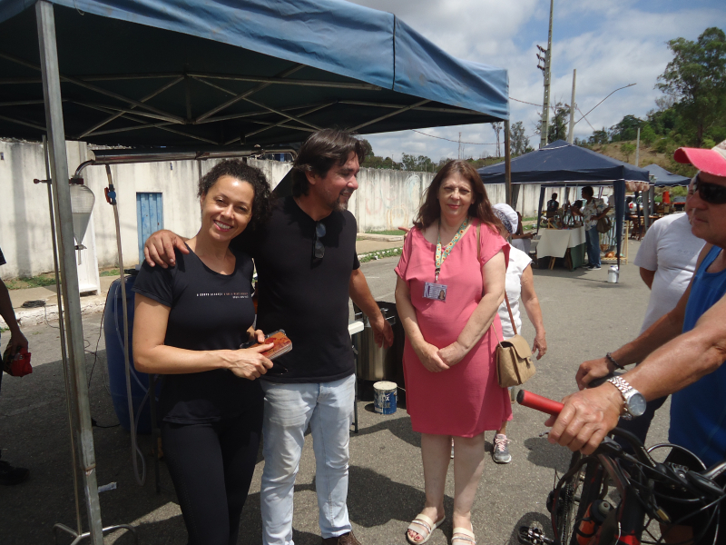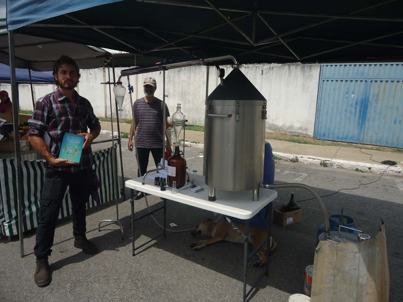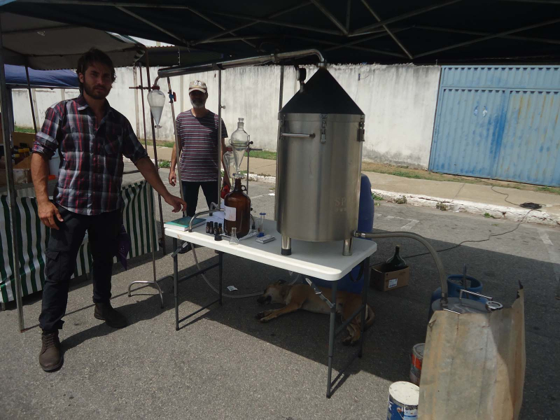 É que uma das barracas da feira comercializa óleos essenciais, que são substâncias aromáticas naturais, altamente concentradas, extraídas de diversas plantas. Mas dessa vez, além da venda dos frascos, os expositores fizeram a demonstração da extração dos óleos.