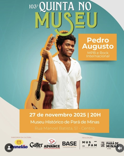 O Projeto Quinta no Museu desta noite vai apresentar um espetáculo regado a MPB e Rock Internacional com muita potência vocal, no show de Pedro Augusto.