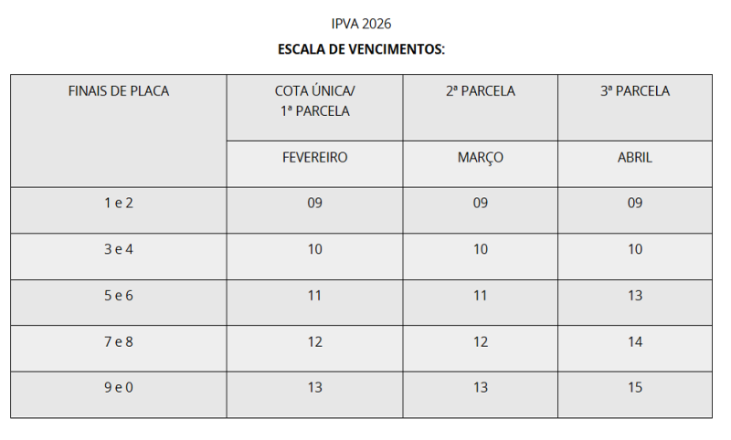 A Secretaria de Estado de Fazenda de Minas Gerais (SEF-MG) anunciou o calendário de vencimentos e os valores do IPVA 2026 para os veículos emplacados no estado. O pagamento, tanto em cota única quanto da primeira parcela, terá início em 9 de fevereiro para os automóveis com placas terminadas em 1 e 2.