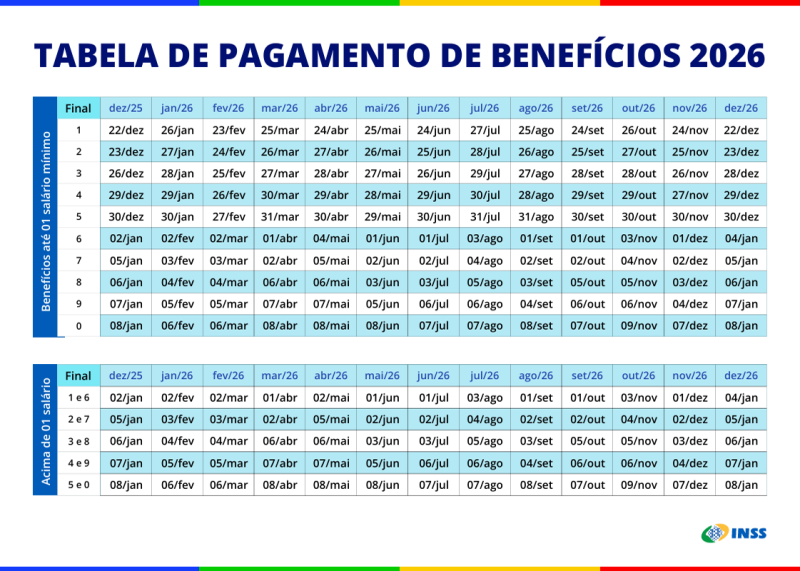 De acordo com o órgão, os pagamentos de aposentadoria, pensão e auxílios do mês de janeiro, terão início no dia 26 para segurados que recebem até um salário mínimo. Os depósitos serão realizados de forma escalonada até o dia 6 de fevereiro, conforme o número final do cartão de benefício.