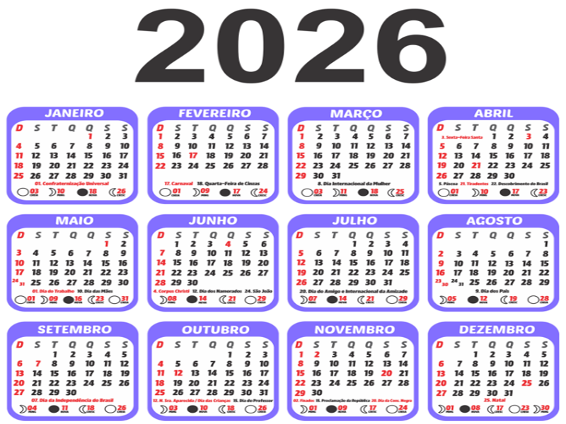 O Governo Federal publicou a portaria que define o calendário de feriados nacionais e pontos facultativos para o ano de 2026. Ao todo, estão previstos dez feriados nacionais, sendo que apenas um deles cairá no fim de semana: o da Proclamação da República, celebrado em 15 de novembro, um domingo.