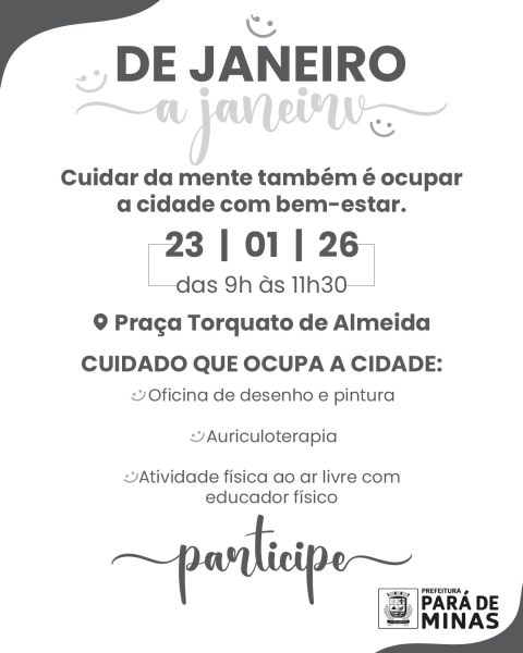 A programação do Janeiro Branco aqui na cidade vai até o final do mês, com atividades desenvolvidas nas unidades básicas de saúde e ações especiais junto à comunidade.