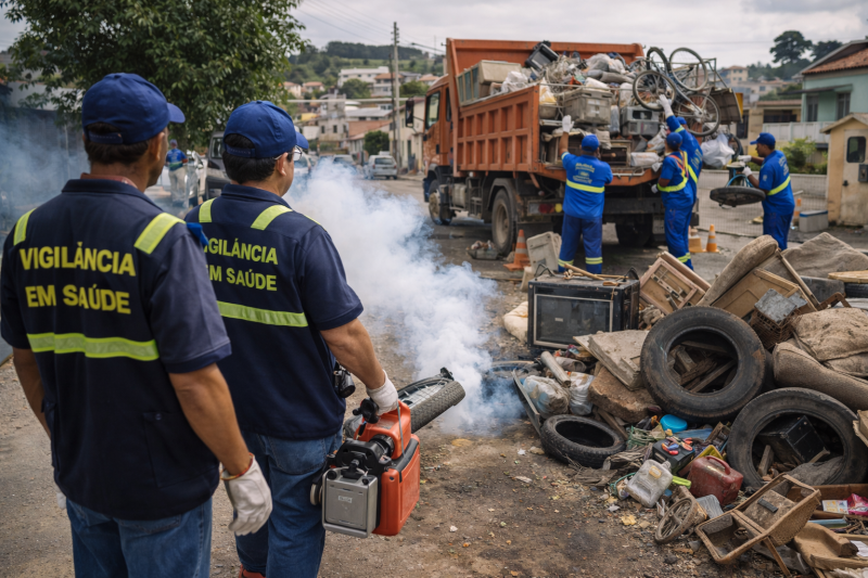 Agentes da Vigilância em Saúde, em parceria com funcionários da Secretaria de Obras, estão trabalhando desde as sete da manhã em mais um mutirão de limpeza em Pará de Minas.
