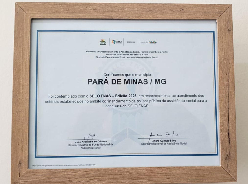 A Prefeitura de Pará de Minas acaba de receber o Selo FNAS 2025, que é concedido pelo Fundo Nacional da Assistência Social (FNAS). Trata-se de um reconhecimento pela gestão de excelência, transparência e eficiência orçamentária e financeira da assistência social.
