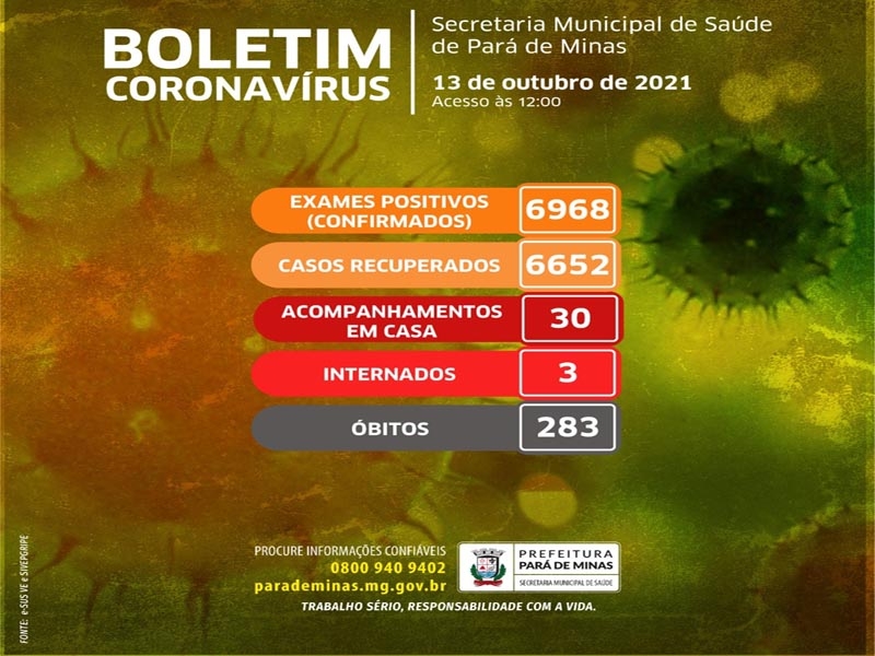 A Secretaria Municipal de Saúde atualizou o boletim do coronavírus em Pará de Minas. No feriadão, 24 pessoas testaram positivo. Já os acompanhamentos domiciliares caíram para 30.