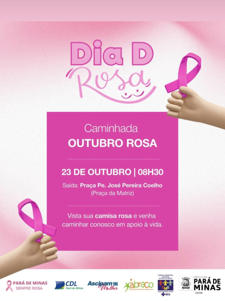 Em Pará de Minas o Dia D Rosa será marcado pela realização de uma caminhada, na rua Benedito Valadares, no próximo dia 23 de outubro. A concentração acontecerá na praça Padre José Pereira Coelho, às 8h30, com a participação de várias entidades.