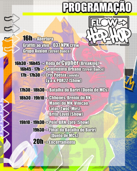 A programação inclui batalha de rap, apresentações de break e street dance, exposições de grafite e barraquinhas de artesanato. O evento é gratuito.