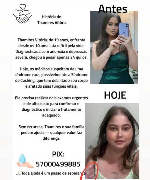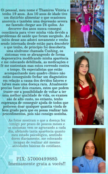 A história de Thamires Vitória Santos, de 20 anos, tem comovido a população de Pará de Minas. Ela enfrenta uma luta difícil para conseguir um diagnóstico preciso, já que tudo indica que é vítima da Síndrome de Cushing.