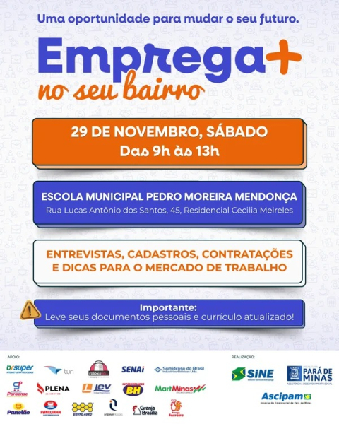 Uma parceria da Secretaria Municipal Assistência e Desenvolvimento Social com o SINE, entidades e empresas de Pará de Minas vai viabilizar a realização da primeira edição do projeto ‘Emprega + no seu bairro’.