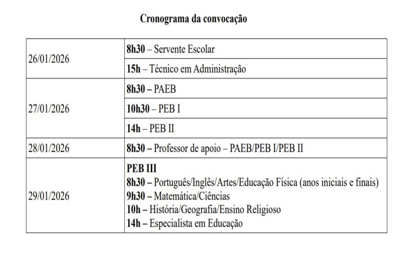 As convocações acontecem entre os dias 26 e 29, no CMEI Professor Geraldo Martins, e envolvem diversas funções essenciais para o funcionamento das escolas.