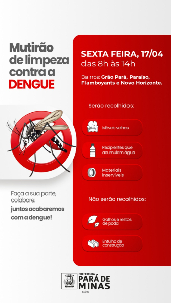 Durante o mutirão desta sexta-feira, das 8h e 14h, serão recolhidos móveis velhos, recipientes que acumulam água e materiais inservíveis, exceto galhos, restos de poda e entulhos de material de construção.