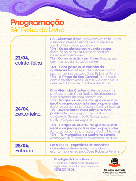 O Colégio Sagrado Coração de Maria, de Pará de Minas, abriu hoje, às 8 horas, a 34ª Feira do Livro. É um dos eventos mais tradicionais do gênero em toda a região. A feira está em atividade desde 1992 e sempre traz homenagens aos nomes importantes da literatura.