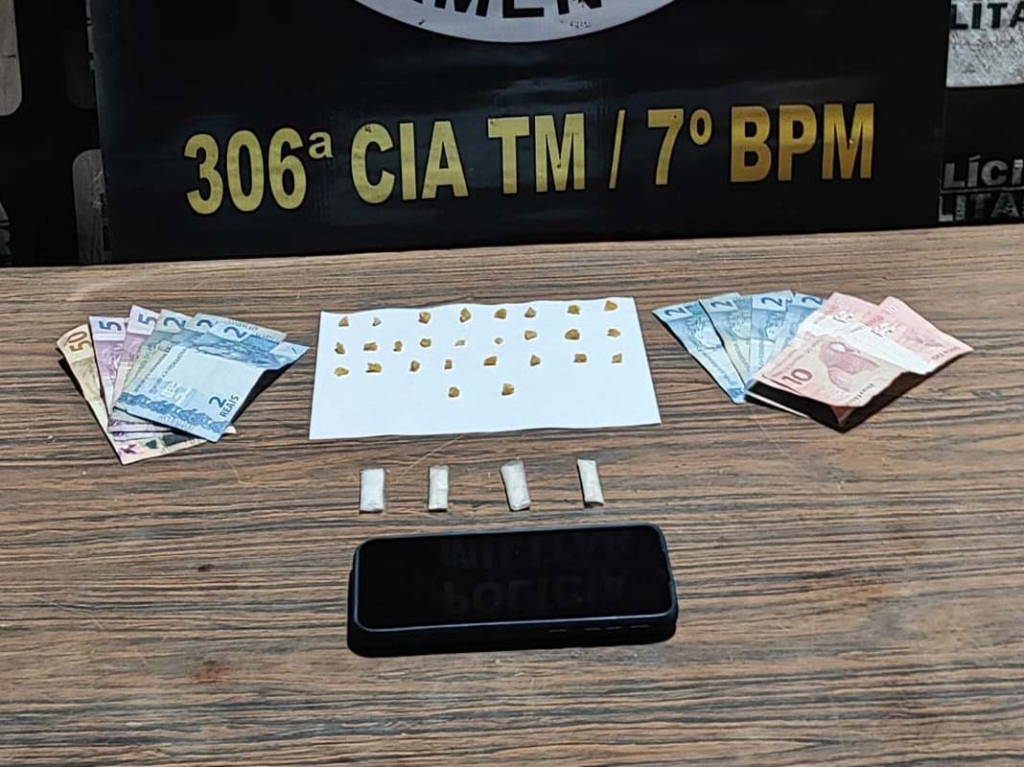 Ao chegarem ao local, os policiais flagraram os suspeitos nas proximidades do imóvel. Durante a abordagem, foram encontrados um celular e R$ 96 em dinheiro, sendo R$ 66 com um dos homens e R$ 30 com o outro.
