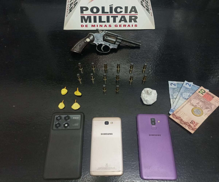 Durante as buscas, os militares apreenderam um revólver Taurus calibre .32, 14 munições, quatro papelotes e uma porção grande de substância análoga à cocaína, três aparelhos celulares e R$15,00 em dinheiro. Ainda segundo a Polícia Militar, o homem de 28 anos possui diversas passagens policiais por tráfico de drogas, porte ilegal de arma, roubo, homicídio e por tentar ingressar com celular em presídio.