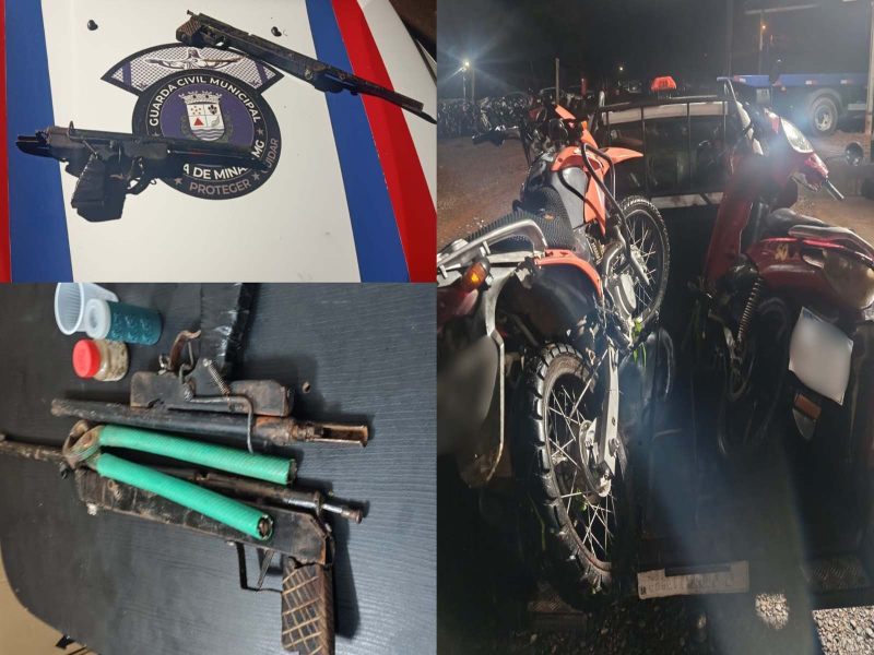 Eles informaram ainda que os suspeitos possivelmente teriam fugido por uma área de mata próxima, onde visualizaram uma motocicleta caída. Diante das informações, os agentes adentraram a mata e localizaram duas motos que haviam sido furtadas. Além disso, foram encontradas duas armas de fogo artesanais e uma chave tipo turquesa, comumente utilizada para arrombamento.