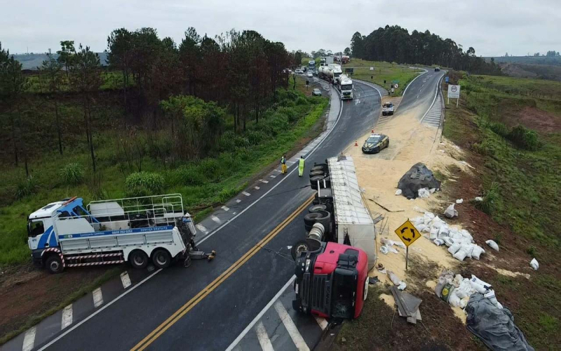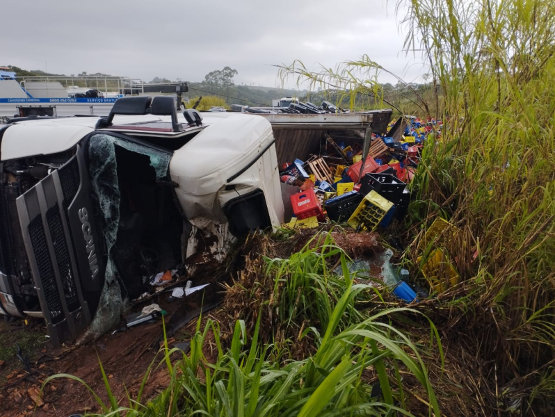 Minutos depois, às 7h15, no km 559, em Córrego Danta, outra carreta tombou na pista. Desta vez, o veículo transportava cerveja e seguia de Belo Horizonte para Uberlândia. Segundo a PRF, o motorista perdeu o controle em uma curva acentuada, sob chuva, e parte da carga se espalhou pela via. Há suspeita de velocidade acima do permitido no trecho.