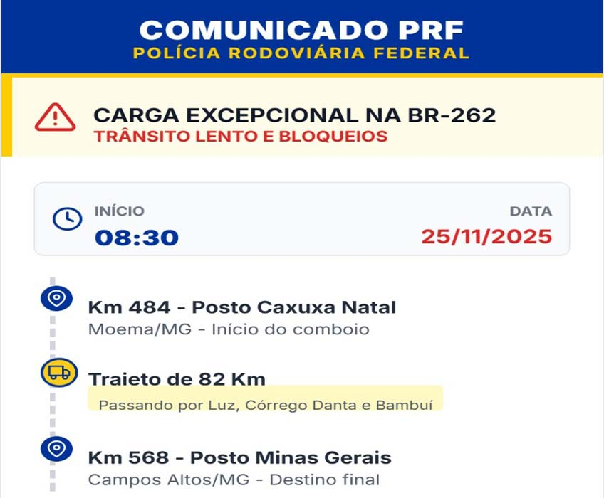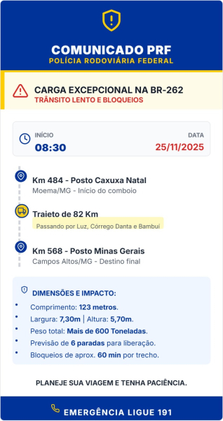 A Polícia Rodoviária Federal alerta para a passagem de uma carga superdimensionada nesta terça-feira, dia 25 de novembro. O comboio sai do Posto Caxuxa Natal, em Moema, e segue até o Posto Minas Gerais, na região de Córrego Danta.