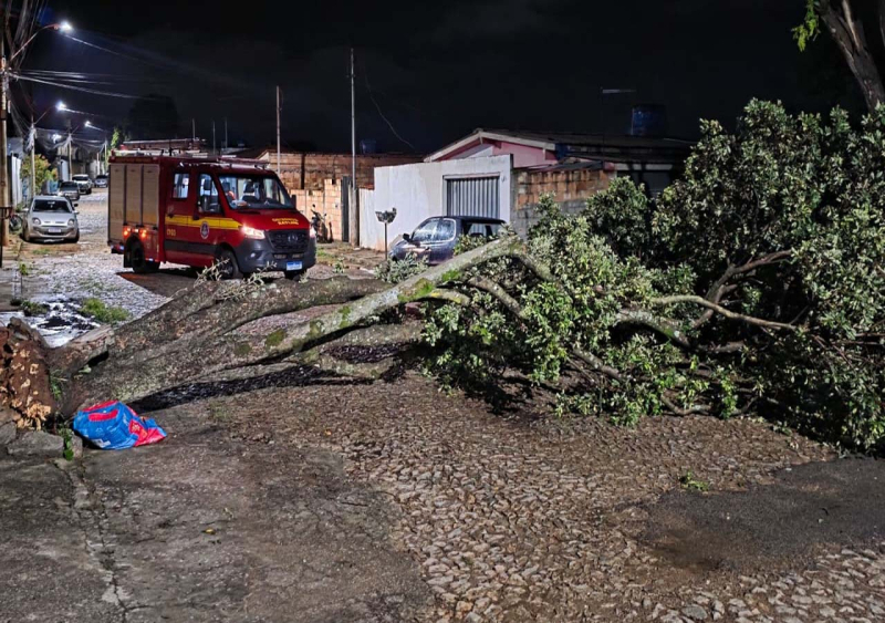 Devido às chuvas que atingiram a cidade, uma árvore caiu e interditou completamente a via. Por pouco, o incidente não resultou em danos maiores, já que a árvore não atingiu residências nem um veículo estacionado nas proximidades, evitando riscos à vida e prejuízos materiais.