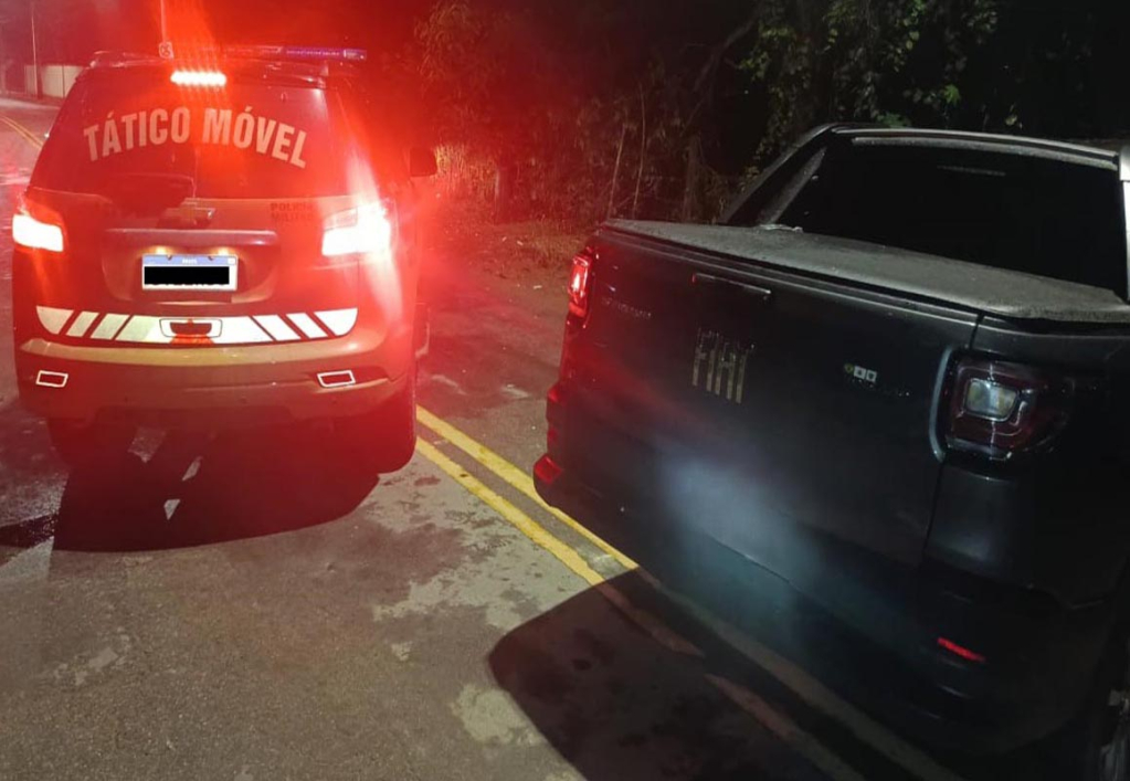 O carro foi abordado no centro e dois homens foram detidos. Com as informações repassadas, a PM localizou a caminhonete no distrito de Ermida. O condutor tentou fugir, bateu em um poste e foi preso após tentar escapar por um matagal.