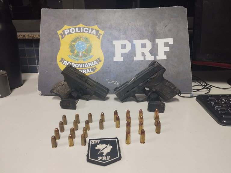 A abordagem aconteceu no km 384 da rodovia. Durante a vistoria do veículo, os policiais encontraram duas pistolas escondidas no tanque de combustível: uma calibre .380, com 15 munições, e outra calibre 9 mm, acompanhada de 13 munições.