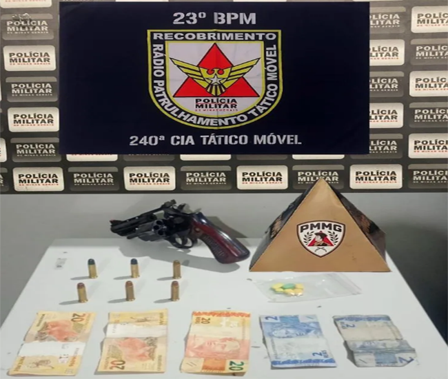 Durante o patrulhamento, policiais do 23º Batalhão localizaram o suspeito dirigindo um carro pela rua São Sebastião Gontijo. Ao perceber a presença da viatura, o motorista tentou fugir, mas acabou sendo abordado junto com o passageiro. No interior do veículo, os militares encontraram um revólver calibre 38 com seis munições e R$ 64 em dinheiro.