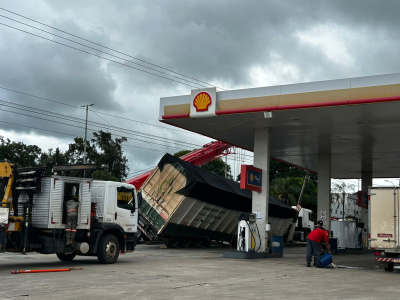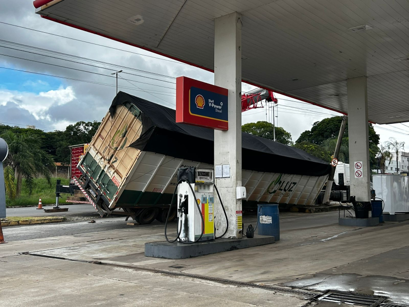 Susto na avenida Ovídio de Abreu, na área de estacionamento do Posto Vale Verde (antigo Posto Avenida). O motorista de uma carreta foi desengatar a carroceria do veículo e ela tombou, danificando a estrutura de um poste de iluminação pública.