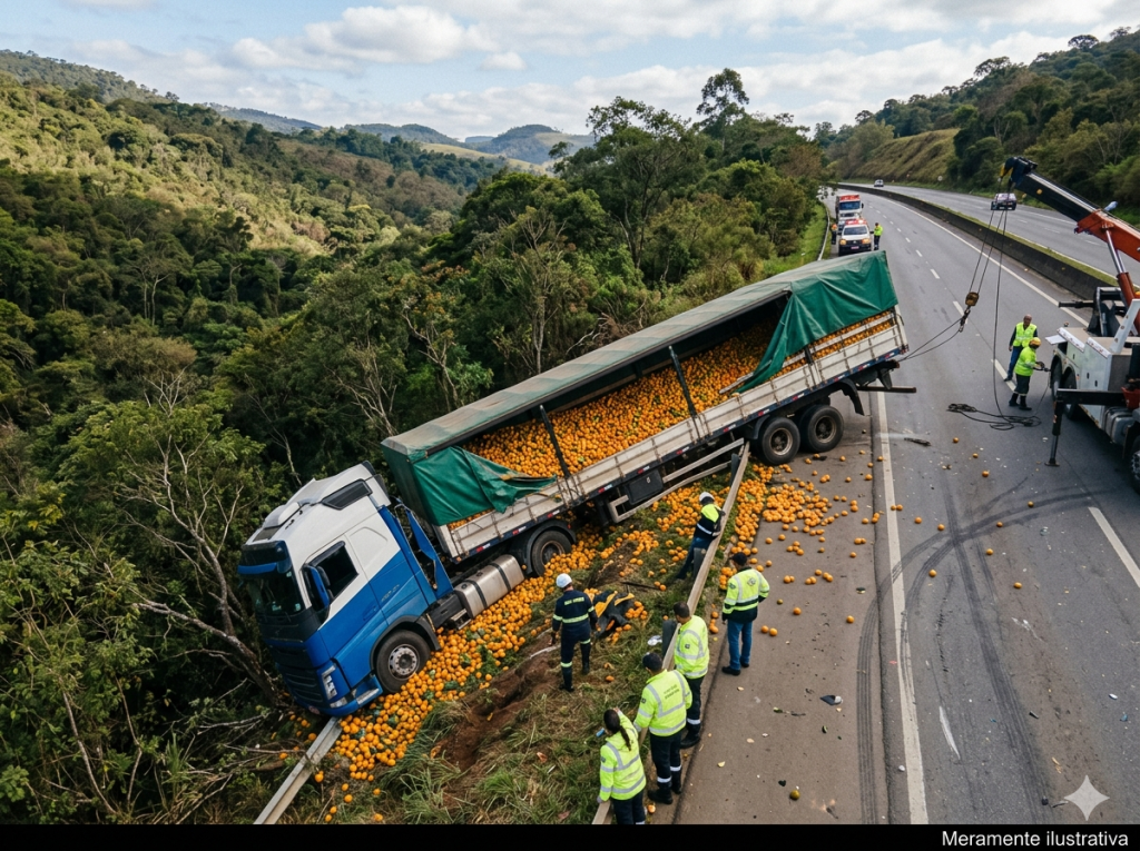 Carreta carregada de mexericas despenca em ribanceira e fecha a br-381 em Brumadinho