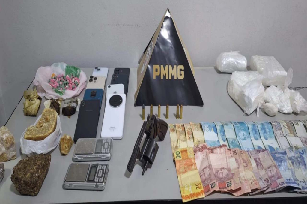 No local, foram localizados um revólver calibre .38 e seis munições do mesmo calibre, além de grande quantidade de drogas, entre elas cerca de dois quilos de cocaína, aproximadamente um quilo de crack e porções de maconha, ecstasy e haxixe.