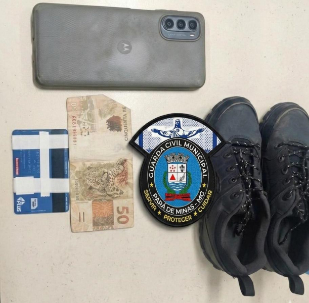 Com ele, foram encontrados um aparelho celular, um par de tênis, um cartão bancário em nome de terceiros e R$ 50,00 em dinheiro, não sendo apresentada justificativa plausível quanto à origem dos objetos, que foram apreendidos.