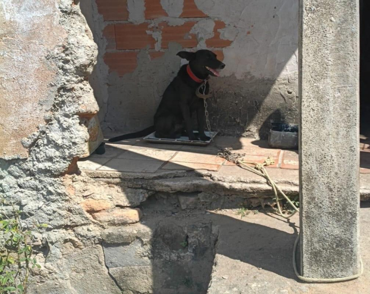 No local, os militares encontraram um cão em situações de maus tratos, acorrentado em um poste na via pública do lado de fora da residência sem abrigo adequado e com condição corporal incompatível para seu porte.